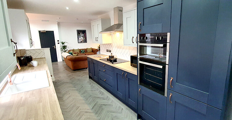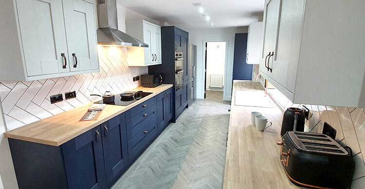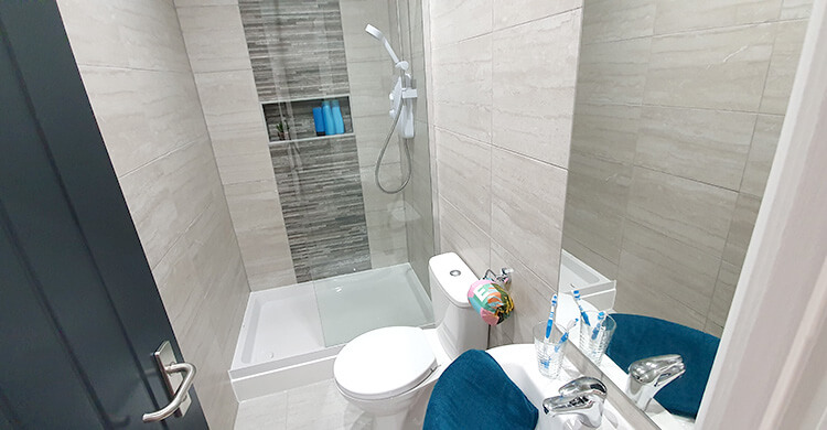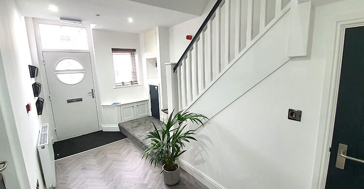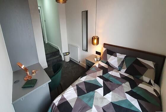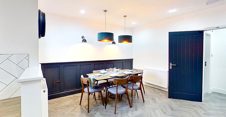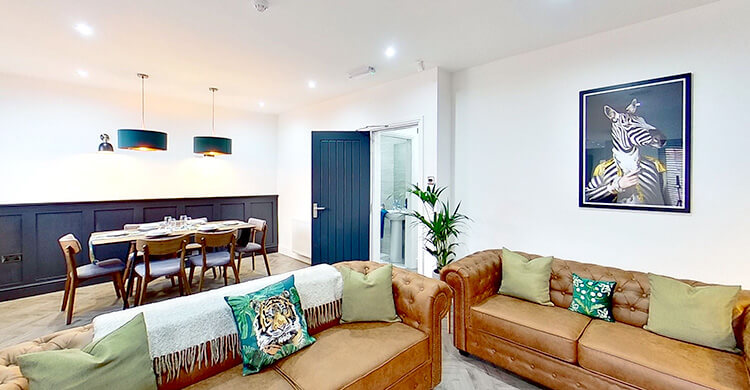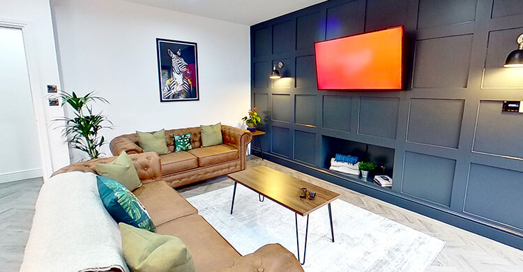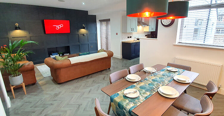 The house has a total of six bedrooms, distributed across two floors. Shared spaces include the vibrant fitted kitchen complete with dishwasher, a large lounge and diner area with a 50” smart TV, plus 3 separate bathrooms.