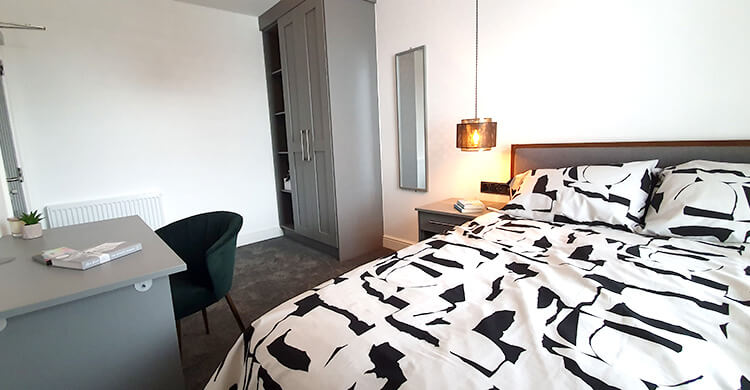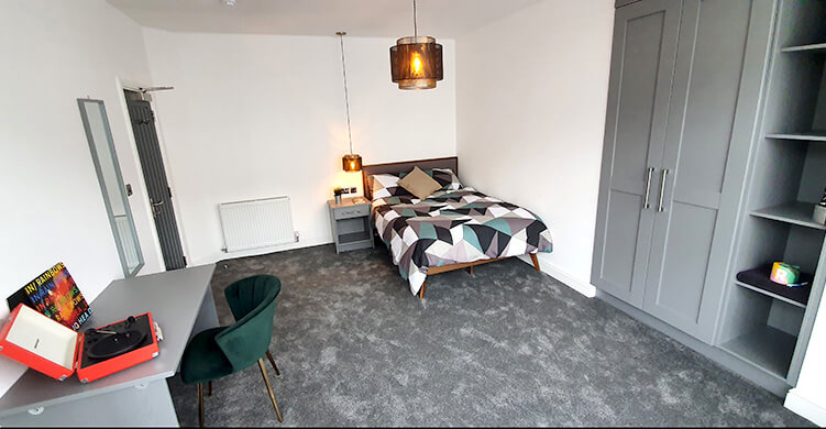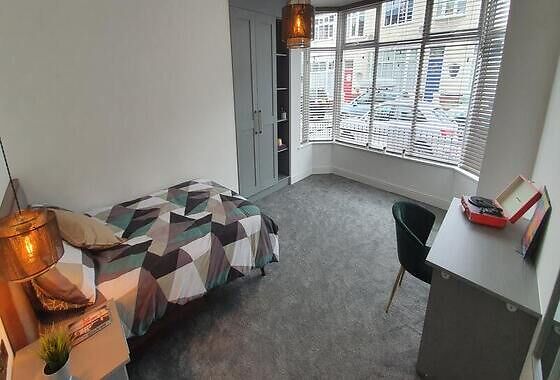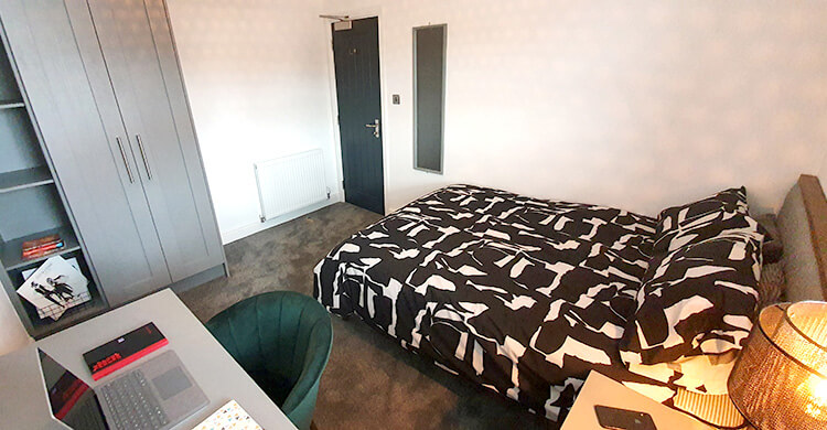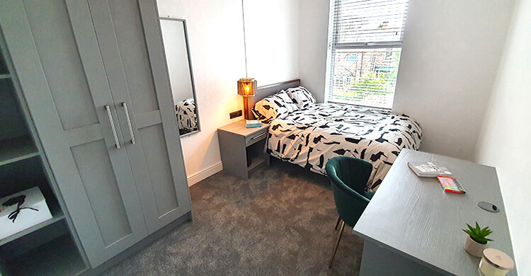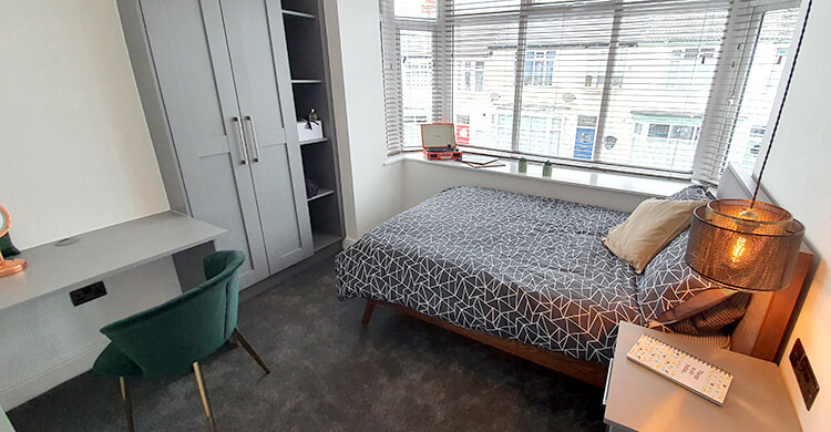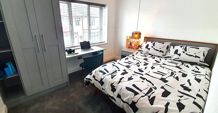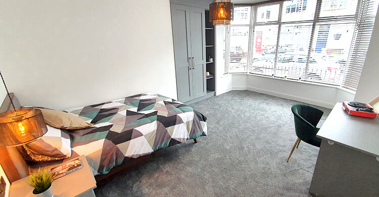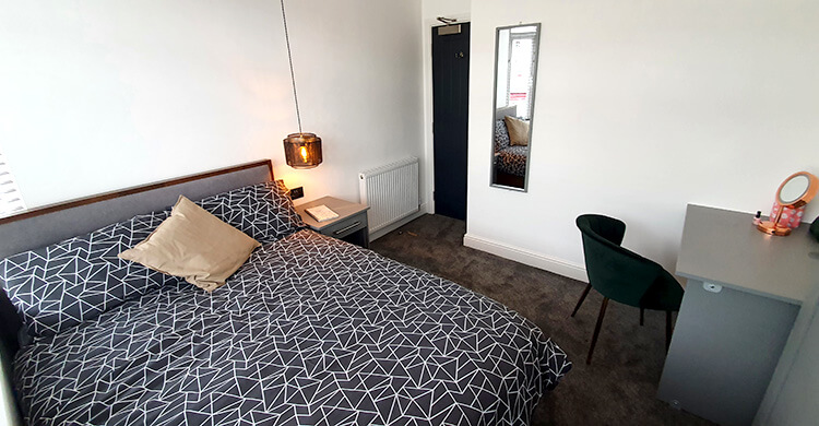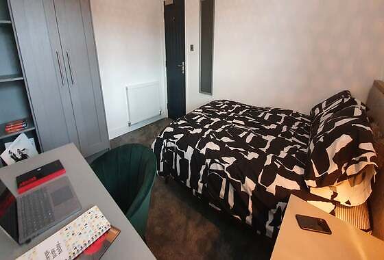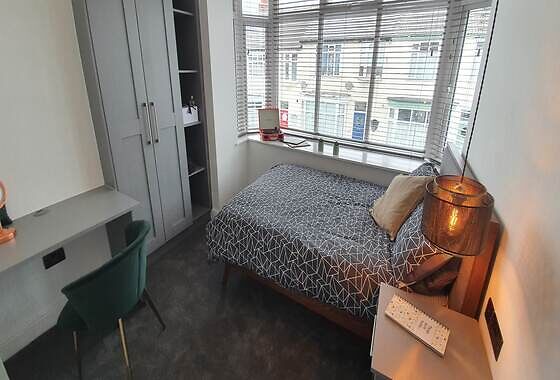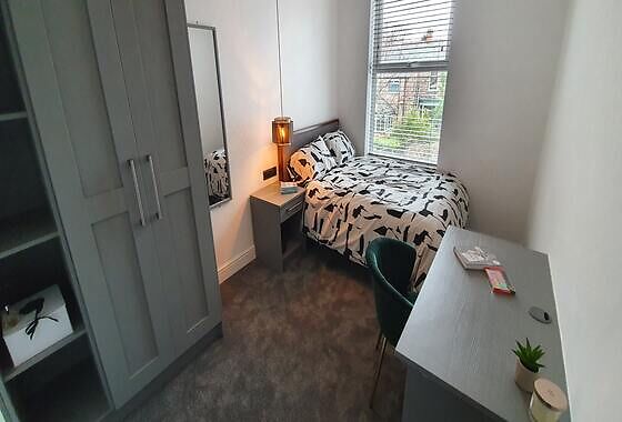 This large room is on the ground floor of the property and is sized at 4.2m by 5.3m. It comes furnished with a double bed, desk and chair, plus a wardrobe.
